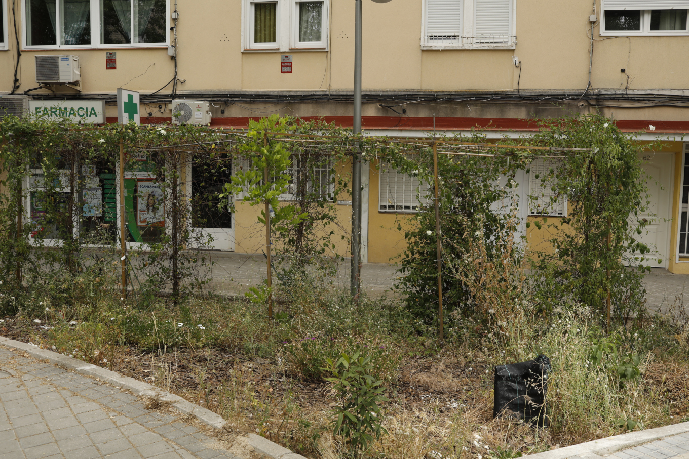 A continuación dotó al espacio de volumen instalando una pérgola en el parterre situado frente a la farmacia, que rápidamente comenzó a colonizarse con falsos jazmines.